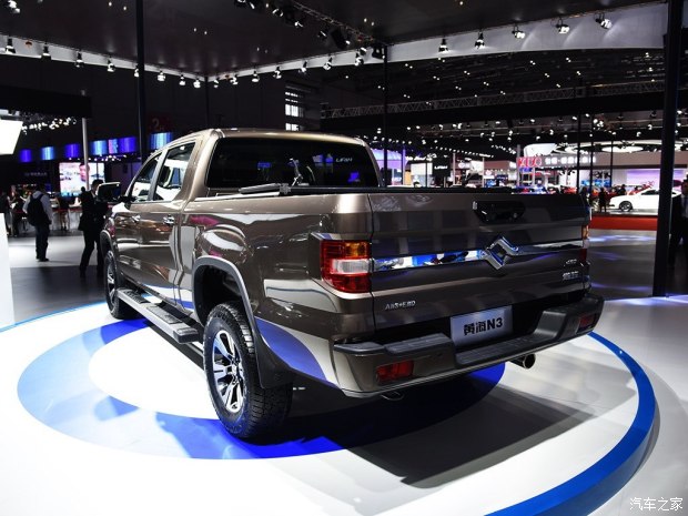 外观方面,黄海N3有着一副高大威猛的外观,前脸线条较为粗犷,大嘴式的前进气格栅看上去很有气势,车尾则保持了皮卡车型一贯的方正造型,不过设计师通过增加尾门的折线以及镀铬装饰条来营造出更强的层次感,看上去不会过于单调。其车身尺寸为5595×1950×1865mm,轴距为3405mm,货厢尺寸为1715x1620x460mm。